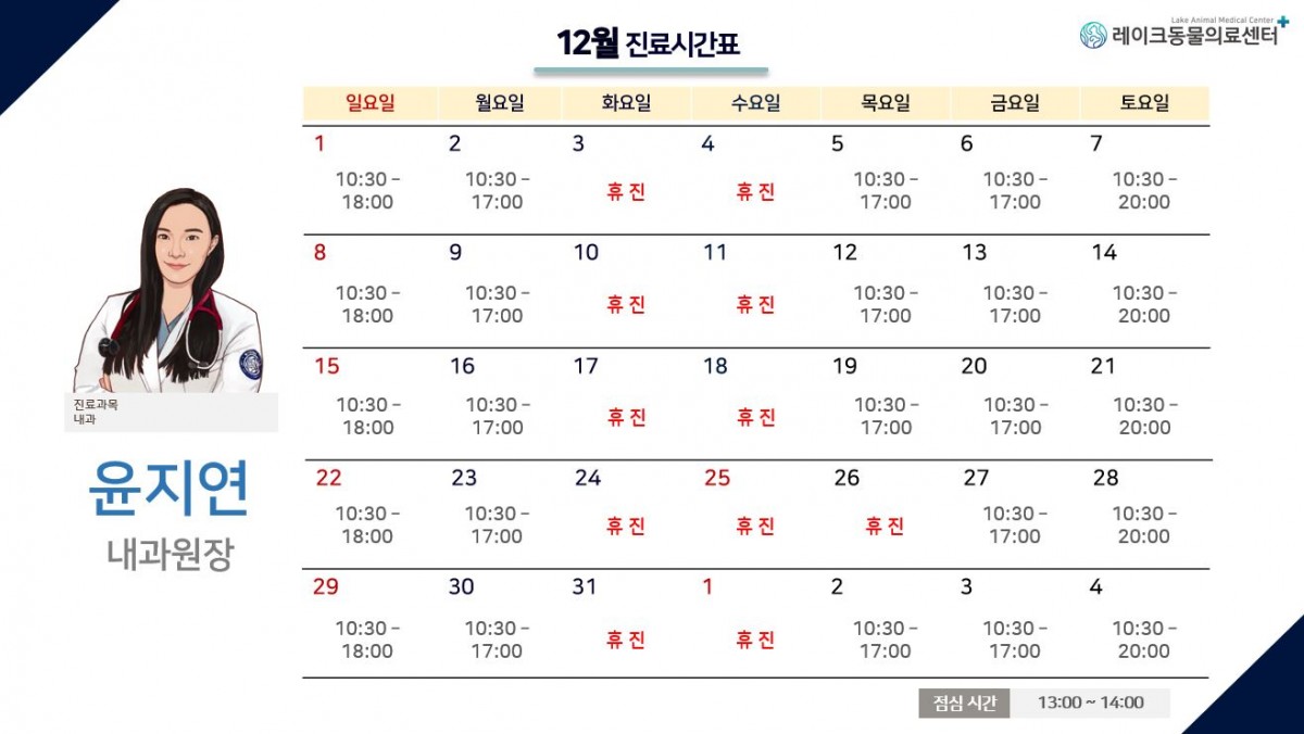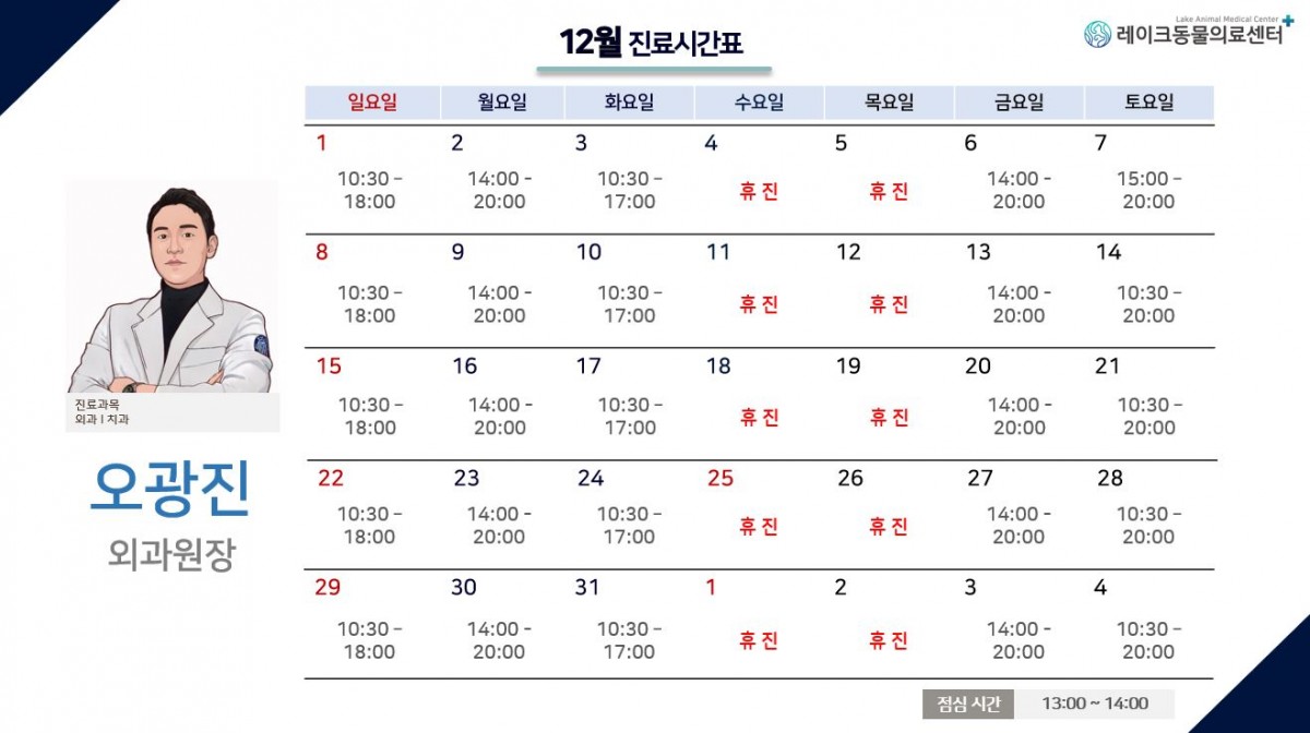 12월 시간표입니다. 작성자 레이크동물의료센터 조회 737회 작성일 24-11-19 15:23 본문 12월 진료시간표 입니다.12.25(수) 크리스마스01.01(수) 신정은 오후 6시까지 단축운영 됩니다.내원에 참고바랍니다.감사합니다.※ 휴진일에도 스텝들이 상주하여 호텔 및 입원환자관리는 진행됩니다 ※ 목록 이전글1월 시간표입니다. 24.12.24 다음글11월 시간표입니다. 24.10.20