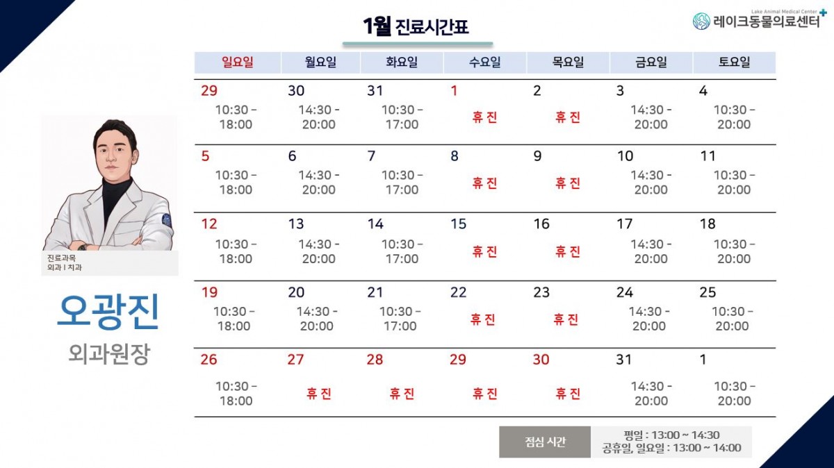 1월 시간표입니다. 작성자 레이크동물의료센터 조회 657회 작성일 24-12-24 20:46 본문 1월 진료시간표 입니다.1.29일 설날 당일에는 휴진1.1(수) 신정 1.27(월) 1.28(화) 1.30(목) 추석 연휴은오후 6시까지 단축운영 됩니다. 1월부터 점심시간이 변경됩니다.기존 13:00 ~ 14:00 에서평일 13:00 ~ 14:30공휴일, 일요일 13:00 ~ 14:00내원에 참고바랍니다감사합니다.※ 휴진일에도 스텝들이 상주하여 호텔 및 입원환자관리는 진행됩니다 ※ 목록 이전글2월 시간표입니다. 25.01.23 다음글12월 시간표입니다. 24.11.19